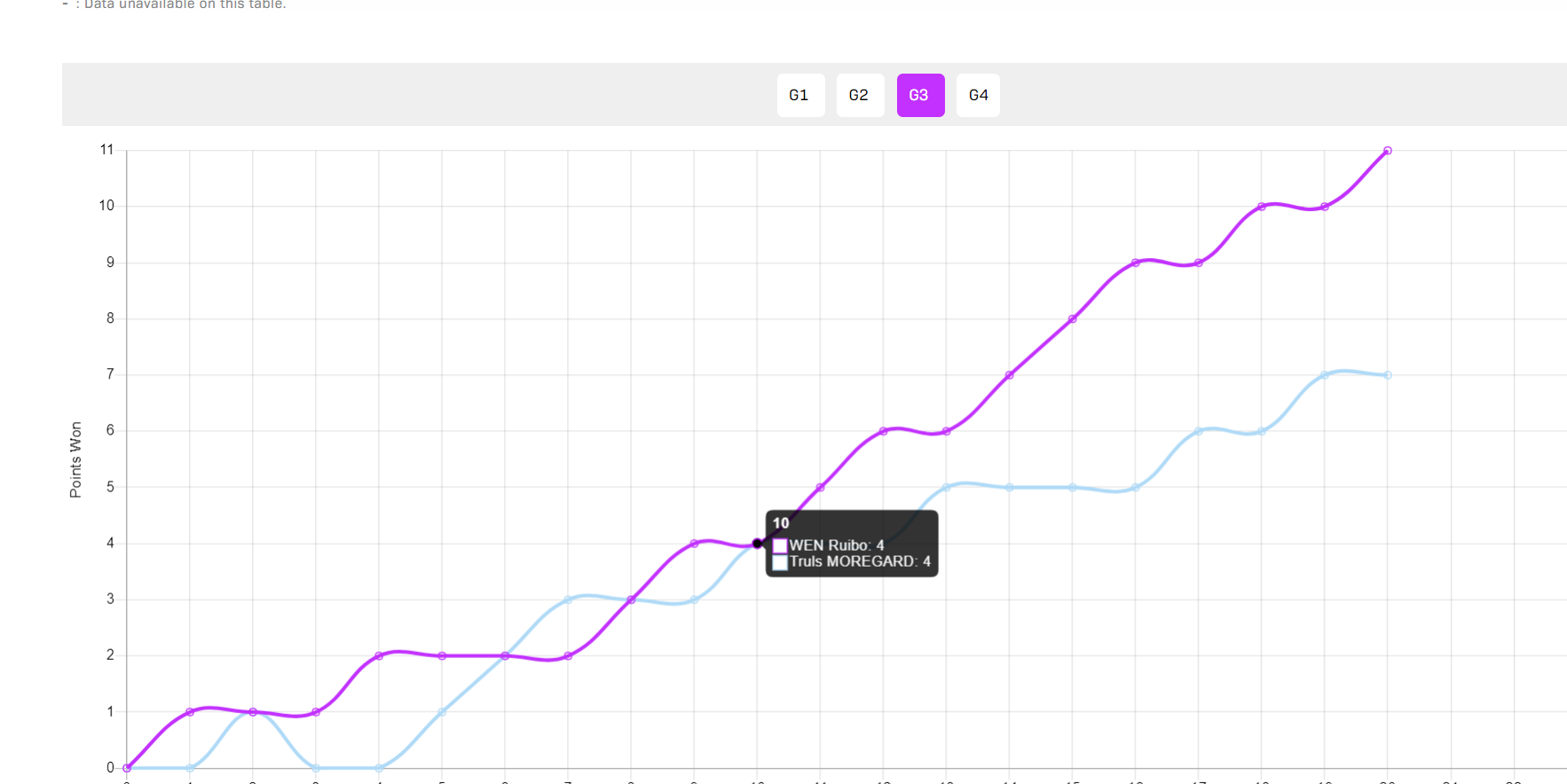 第四局开场温瑞博3-0领先,莫雷加德追到2-3,温瑞博6-2再度拉开,随后温瑞博10-6拿到赛点,莫雷加德追到9-10,但最关键的一分温瑞博还是拿下。
