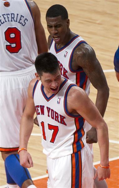 新华社照片,路透,2012年2月11日,尼克斯队球员林书豪(下)庆祝胜利。当日,在2011-2012赛季NBA常规赛中,纽约尼克斯队主场以92比85战胜洛杉矶湖人队。 新华社/路透