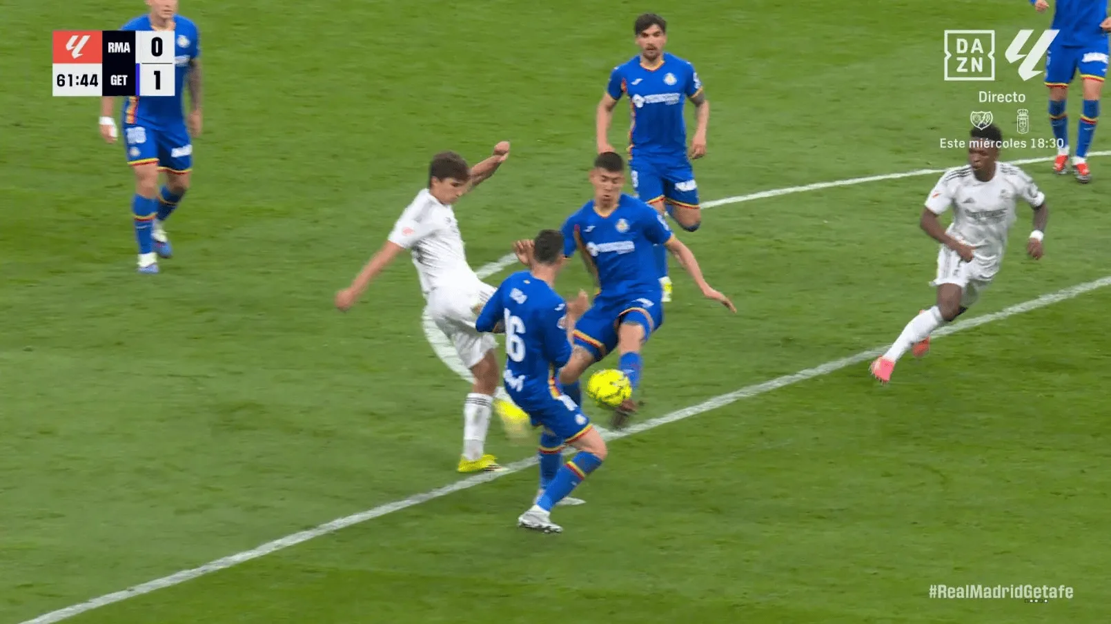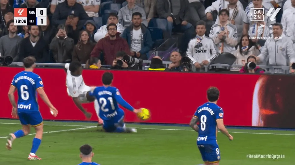 此外,比赛还出现多次疑似点球判罚。一次是扎伊德-罗梅罗与贡萨洛之间的对抗,Archivo VAR认为赫塔菲中卫先行解围,随后才与前锋发生身体接触,因此不构成点球。如果是贡萨洛先触球,则应判罚犯规。